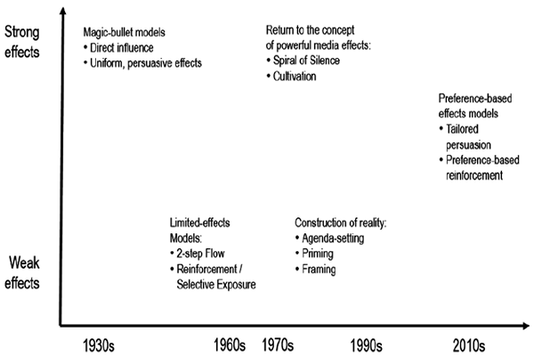 - Definition: “Media exposure impacts audiences in different (positive and negative) ways “Key words: Direct, Indirect, Encoding-decoding, Agenda setting, Audience as a commodity, Audience flow, Audience polarization, reinforcement, Conservative/moralist decision making, Consumer culture creation and reinforcement, Cultivation, Cultural imperialism, Culture of narcissism, Disinhibition, Disposition altering, Empathy activation,  Excitation transfer, Global village, Gratification seeking, Gravitation Hegemony, Heuristic (not systematic) processing, Hidden persuaders, Homogenization, Imitation, Information flow, Information seeking, Integrated response, Interpretation by social class, Interpretive resistance, Knowledge gap, Levels of processing, Limited capacity information processing, Media entertainment, Media dependency, Medium as message, Message construction, Mood management, News factory, News frame creation, News selection, Perception, Power elite, Priming, Principled reasoning, Pseudo-events blur reality, Psychodynamics, Psychological conditioning, Reasoned action, Reception, Selective exposure, Selective gatekeeping, Selective perception, Semiotic interpretations, Social cognitions, Social construction of meaning, Social construction of media technologies, Social identity, Social learning, Social norms, Sociology of news, Spiral of silence, Trivialization of public life, VideomalaiseTheories:(1) The hypodermic  needle: 1920s/1930s Also referred to as “Total effects model” and is still quoted in “moral panics”. Audiences passively receive (and make no attempt to process or challenge) information. Experience, intelligence and opinion of individuals is irrelevant.(2) Two-step flow: 1940s Also referred to as “Limited effects paradigm” Information is mediated by “opinion leaders” who filter it to their less active “associates”.  (3) Uses and gratifications: 1960s Individuals consume texts for different reasons. Diversion (escapism), Personal relationships, Personal ID (finding yourself in texts), Surveillance (useful information for practical purposes), (4) Reception theory: 1980s/1990s There may be more than one reading (decoding/interpretation) of the text, Preference-based (tailored persuasion) 2010s
